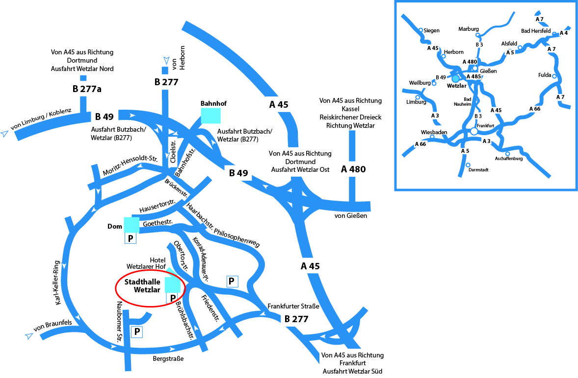 Wetzlar liegt direkt an der A45 und der B49, wodurch die Stadt dank ihrer zentralen Lage in Hessen aus allen Himmelsrichtungen mit dem PKW erreicht werden kann. Die Adresse ist Stadthalle Wetzlar, Brühlsbachstraße 2b, 35578 Wetzlar.