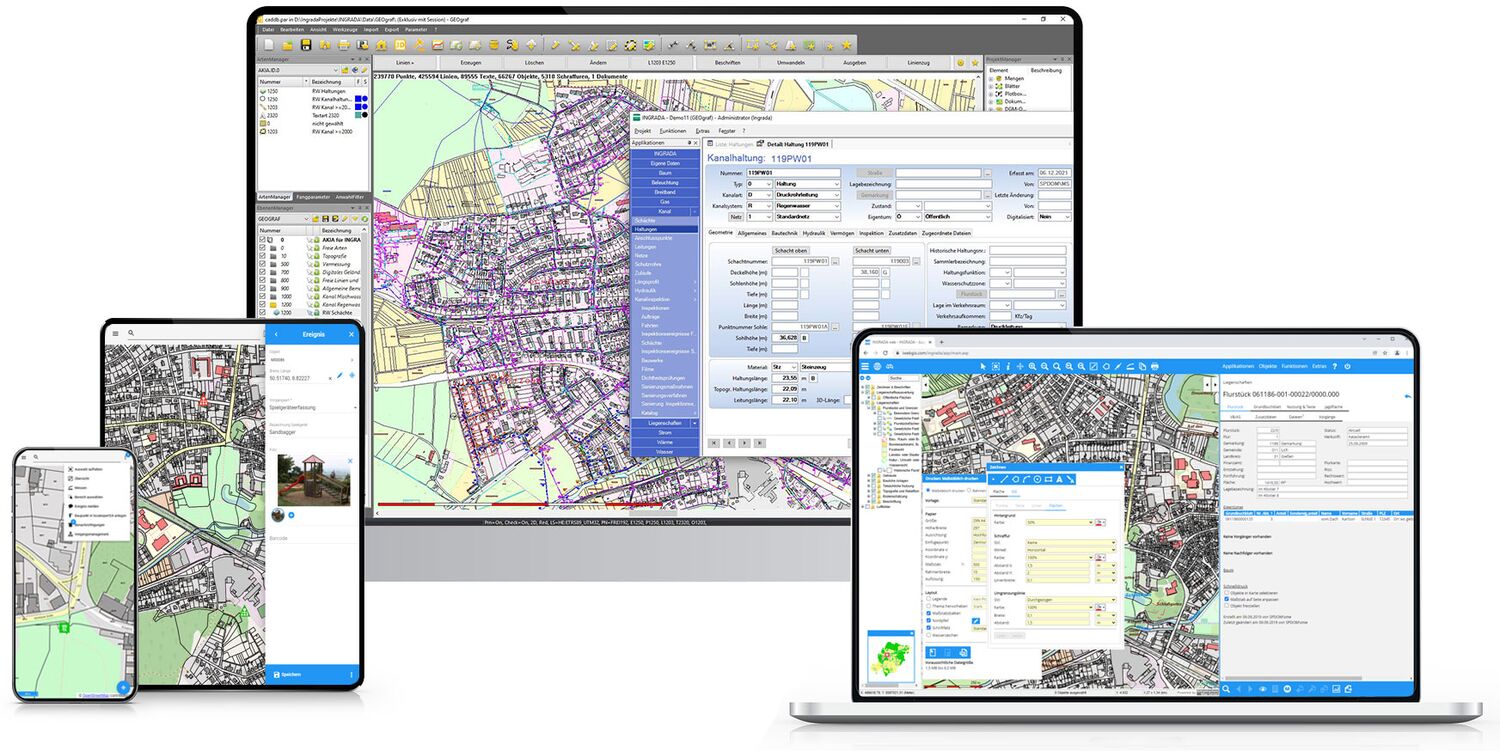 Plattformübergreifender Einsatz von INGRADA auf allen Endgeräten: Desktop-GIS, kommunales Web-GIS, mobiles GIS auf Tablets und Smartphones.